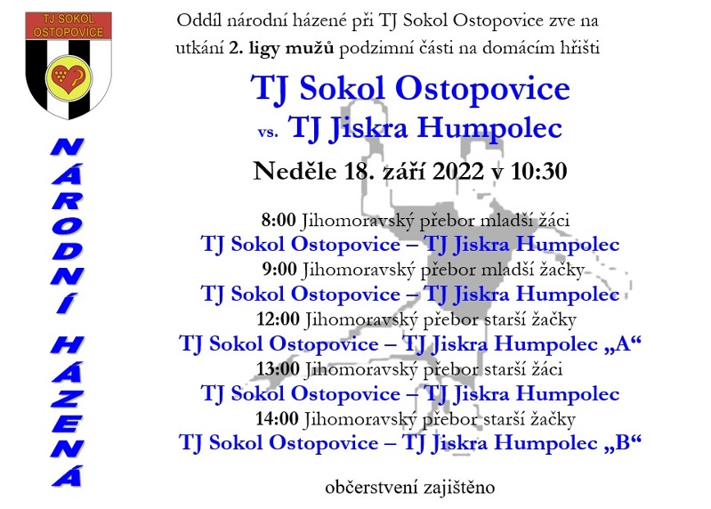 V rámci domácího dvojkola byl sobotním soupeřem nováček ze Staré Vsi. Úvodních 15 minut bylo gólově hodně bohatých, zejména naše obrana byla velmi nepozorná, stav byl 8:7 pro hosty. Pak ale došlo ke změně na křídle v obraně, změnil se přístup i hra obrany a my už do konce poločasu neinkasovali. Útok neměl problém si vytvářet šance, horší už to bylo se střelbou, poločas jsme vyhráli 10:8. Ve druhé půli to bylo parádní představení našich brankářů, kdy oba předváděli místy až neskutečné zákroky, obrana pak sbírala odražené balóny a útok tak měl dostatek prostoru náš náskok navyšovat. Skóre se nakonec zastavilo na 20:12 pro Ostopovice. Po vlažném vstupu do zápasu se hlavně obrana postupem času zlepšila, což rozhodlo. Útok v zápase tolik problémů neměl, škoda jen místy uspěchané, zbrklé a nepřesné střelby. Připsali jsme si tak první výhru v nové sezóně.