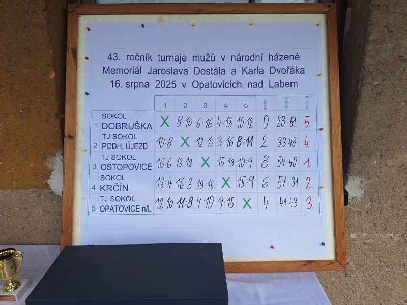 Sobota 16.8. - 43. ročník přípravného mužského turnaje v Opatovicích nad Labem, hrací doba 2x18 minut