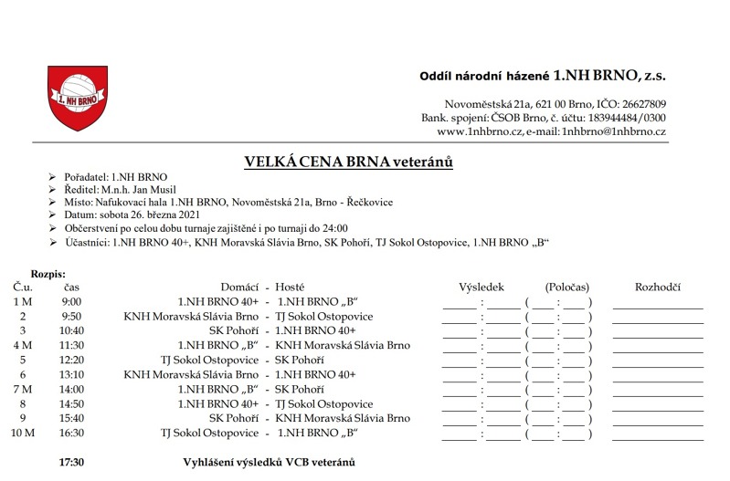 Pozvánka na turnaj veteránů, který pořádá oddíl 1.NH Brno na hřišti v Řečkovicích, kterého se zúčastní i náš oddíl. Turnaj se odehraje již tuto sobotu 26.3.2022. Soupiska zůstává prozatím v tajnosti, ale určitě se máte na co těšit. Rozlosování turnaje v přiloženém obrázku.