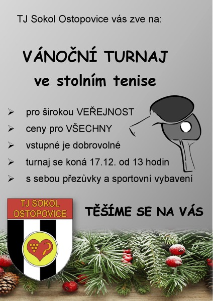 Zveme všechny sportovní nadšence na Vánoční turnaj ve stolním tenise neregistrovaných hráčů. Koná se 17.12.2023 od 13:00 v sále naší sokolovny. Ceny připraveny pro všechny zúčastněné. S sebou si vezměte čistou obuv a sportovní vybavení. Všem přejeme klidný a spokojený adventní čas.